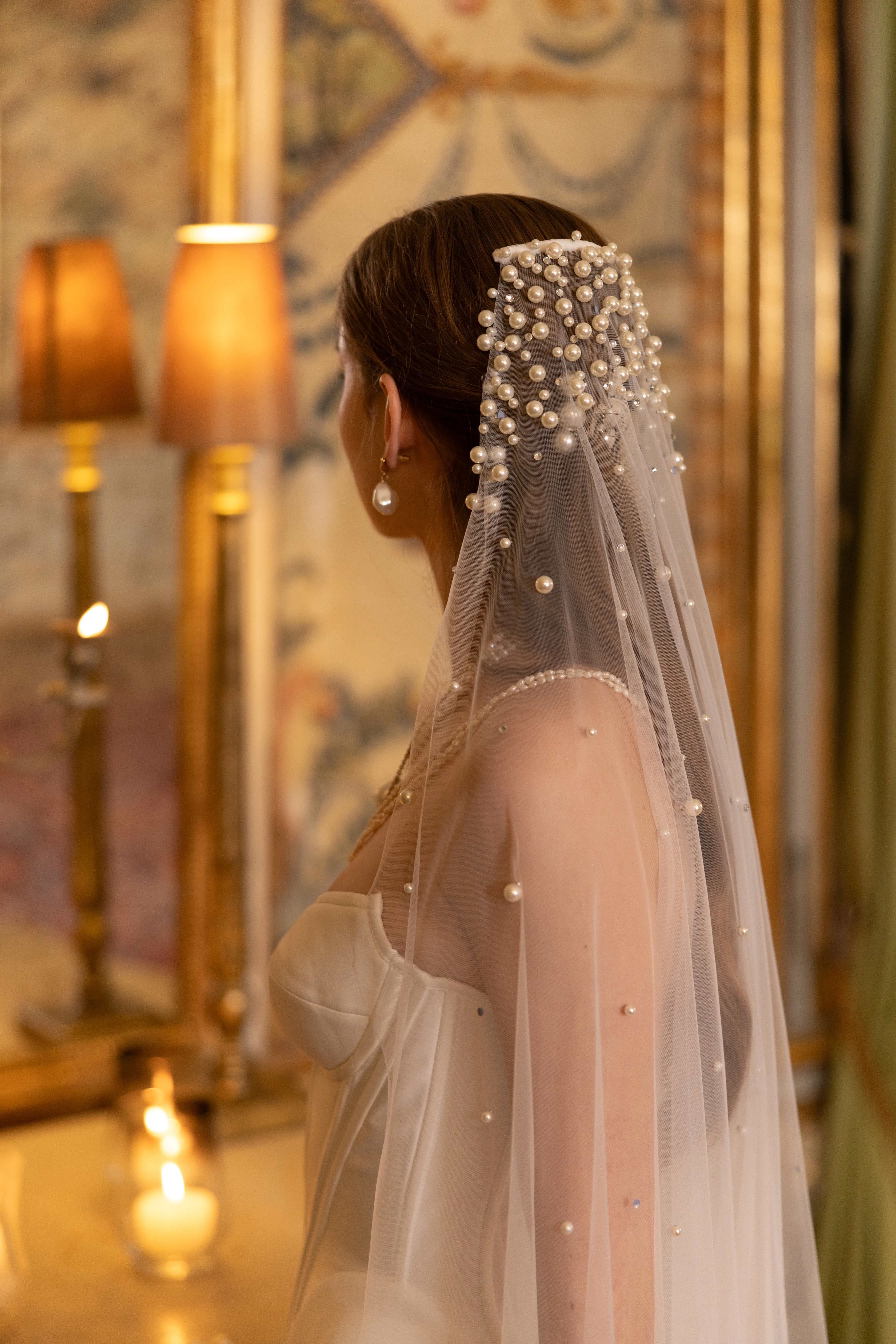 Subtelny jednowarstwowy welon ślubny z perłami to idealny wybór dla panny młodej, która pragnie lekkiego, romantycznego akcentu bez nadmiaru objętości.