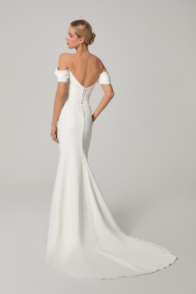 Prosty dekolt i opadające na ramiona rękawy dodają sukni subtelnej zmysłowości, jednocześnie zachowując jej klasyczny charakter. Naturalna linia talii podkreśla proporcje figury, a plisowane akcenty w okolicy bioder wprowadzają interesujący detal, nadając całości wyjątkowego uroku.
