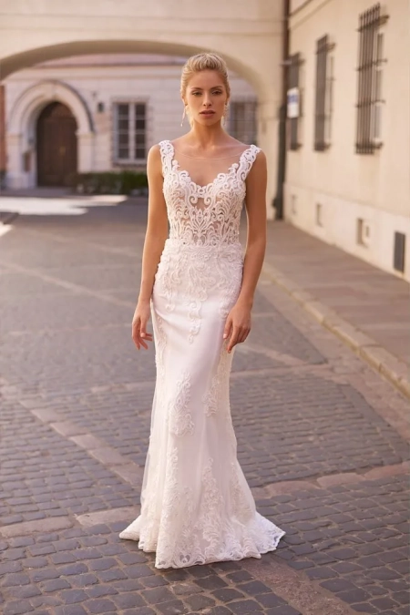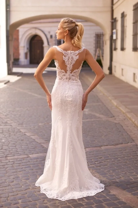 Suknia ślubna Tottie w kształcie syreny. Suknia posiada ramiączka i krótki tren.