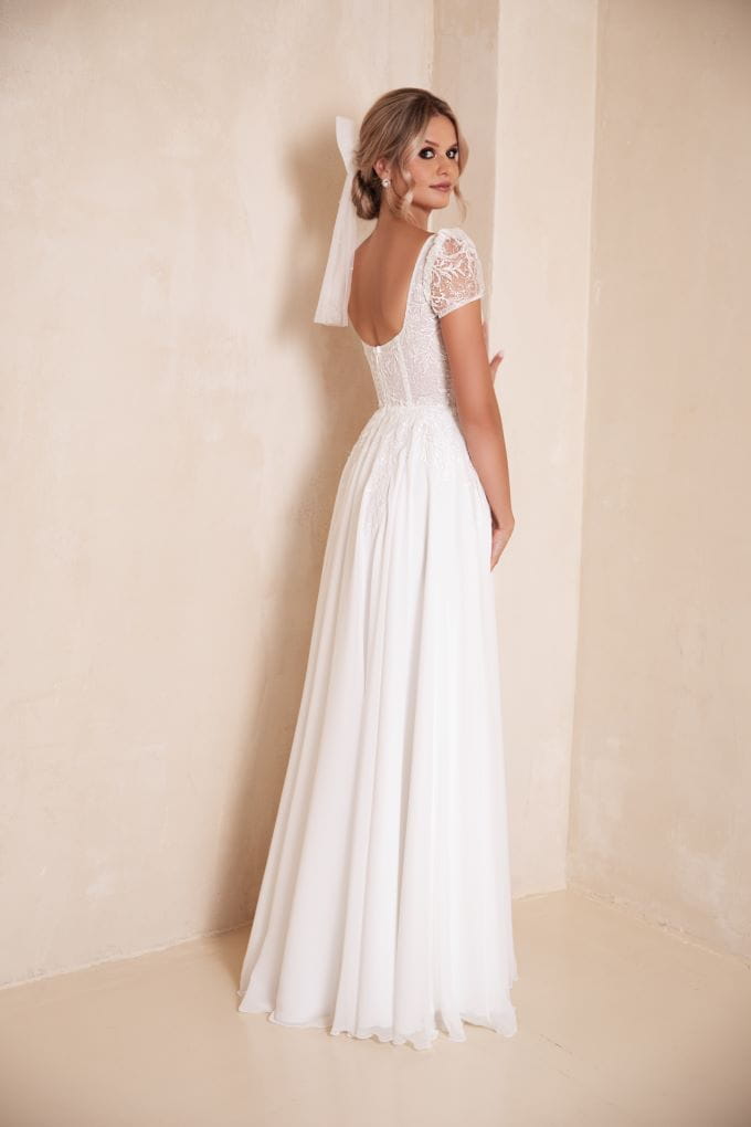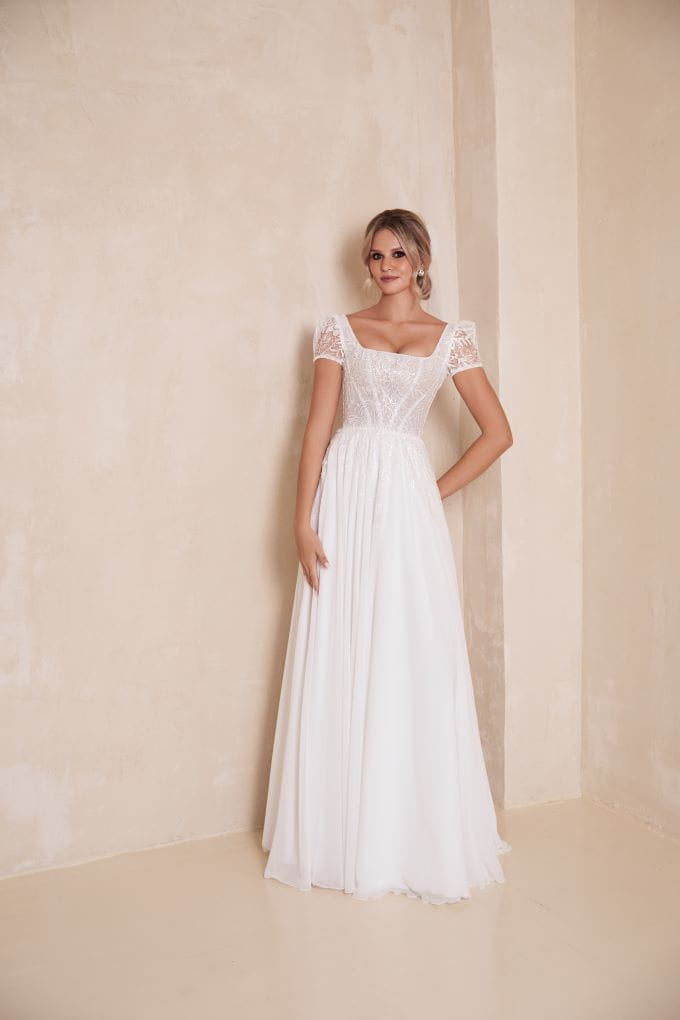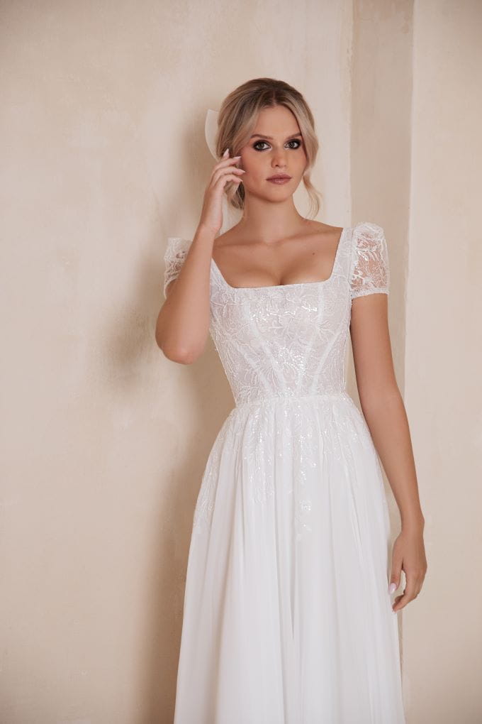 Suknia ślubna Rosemary zachwyca połączeniem klasyki i nowoczesnej subtelności. Gorsetowa góra z misternie wyszywaną koronką i delikatnym połyskiem podkreśla kobiecą sylwetkę, a kwadratowy dekolt pięknie eksponuje obojczyki i biust. Krótkie, koronkowe rękawki dodają wdzięku, a lekko rozkloszowany, zwiewny dół nadaje całości lekkości i ruchu. To idealna propozycja dla panny młodej ceniącej romantyzm i ponadczasową elegancję.