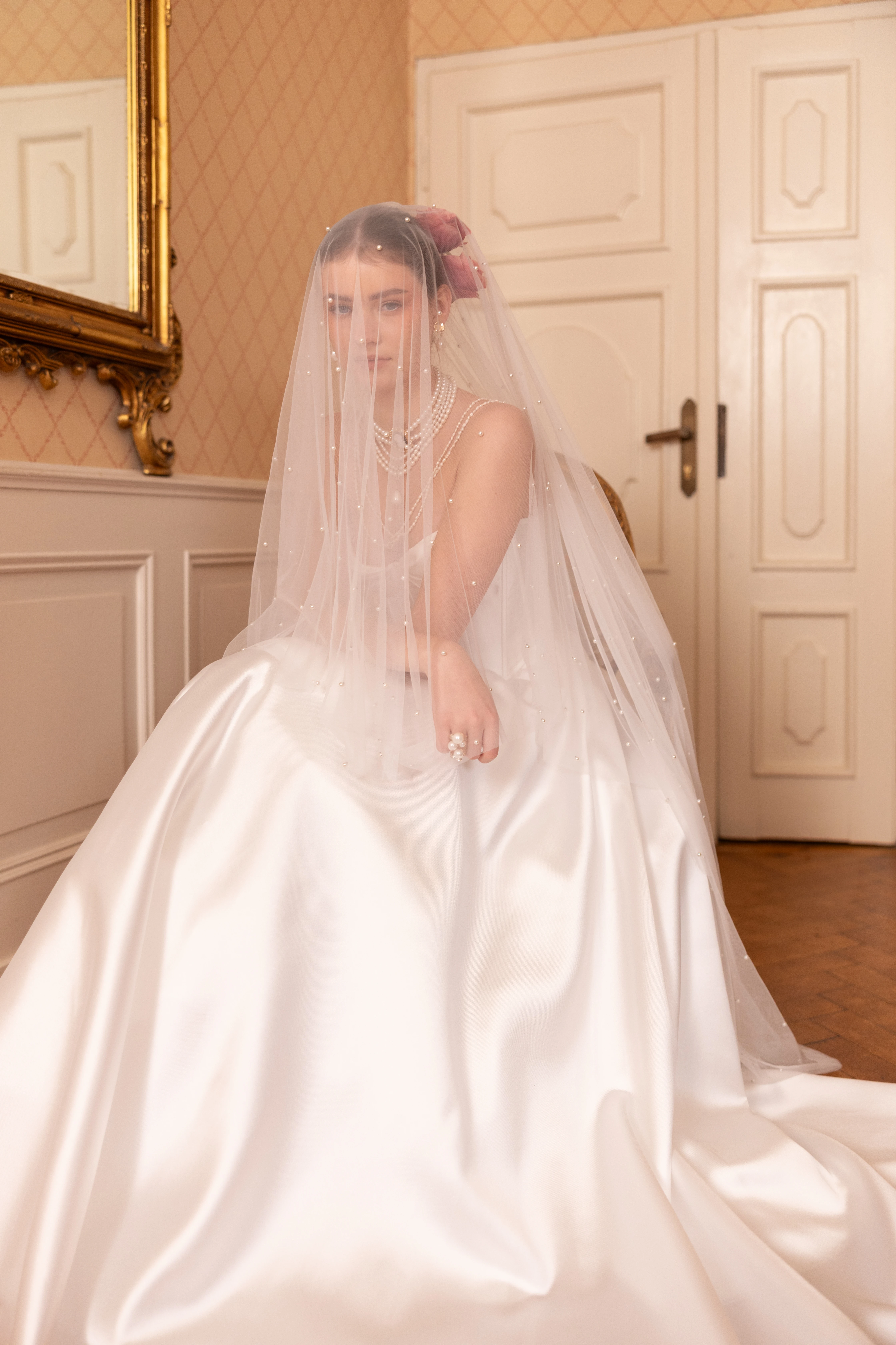 Krótsza warstwa umożliwia zasłonięcie twarzy podczas wejścia do kościoła, dodając chwili wyjątkowej symboliki i elegancji. Wykonany z miękkiego, wysokiej jakości tiulu, welon pięknie się układa, tworząc subtelną, płynną linię. Całość zdobią drobne perełki, które delikatnie połyskują w świetle, nadając welonowi romantycznego i luksusowego charakteru.